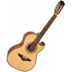 Este bajo quinto H. Jimenez de cuerpo completo está construido con una tapa de abeto de alta calidad y tanto el fondo como los laterales son de caoba. El diapasón es de palisandro de 18 trastes con el tradicional logo láser de H. Jimenez y el puente especial.
