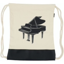 Bolsa tipo saco crema y negra con adorno de piano en negro. Este modelo está impreso por ambas caras e incluye cierre con cordón.