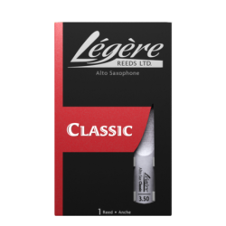 Caña sintética para Saxo Alto marca Légère modelo Standard con dureza de 3½. Las cañas Légère son cañas más duraderas que las tradicionales debido a que están construidas a partir de un material sintético (polímero no toxico) resistente a la humedad y a la temperatura ambiental. Además las cañas Légère se pueden desinfectar fácilmente con agua caliente y algún detergente suave.