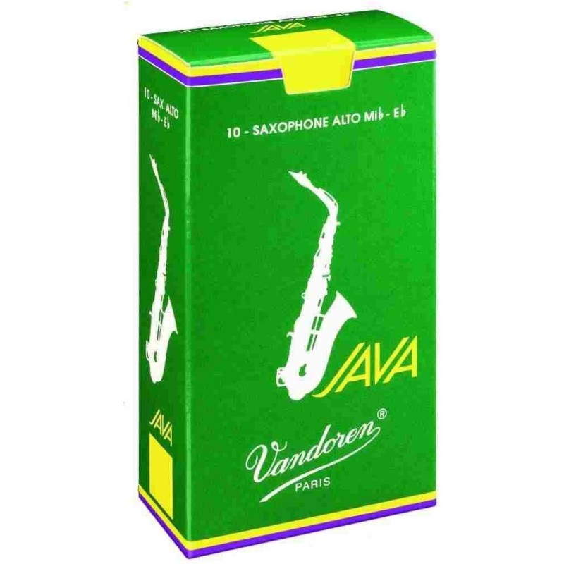 CAJA DE CAÑAS PARA SAXO ALTO.Serie Java. Caja VerdeNúmero 2.Caja de 10 unidades. Ref. SR262Creadas en 1983 para jazz y variedades. Las cañas JAVA tienen un extremo más grueso que las cañas tradicionales y vibran sobre una paleta* más larga,con una elasticidad máxima. Este tipo de columna vertebral, que permite una zona de elasticidad muy grande, ofrece al músico una mayor flexibilidad de interpretación. Las cañas JAVA son más flexibles que las cañas Tradicionales y las V16, vibran sobre una gran paleta, desarrollando, por tanto, un sonido brillante con una respuesta inmediata. * Paleta: zona donde las ondas se propagan con la mayor amplitud. Desde la punta, las ondas son absorbidas más lejos en las cañas JAVA.