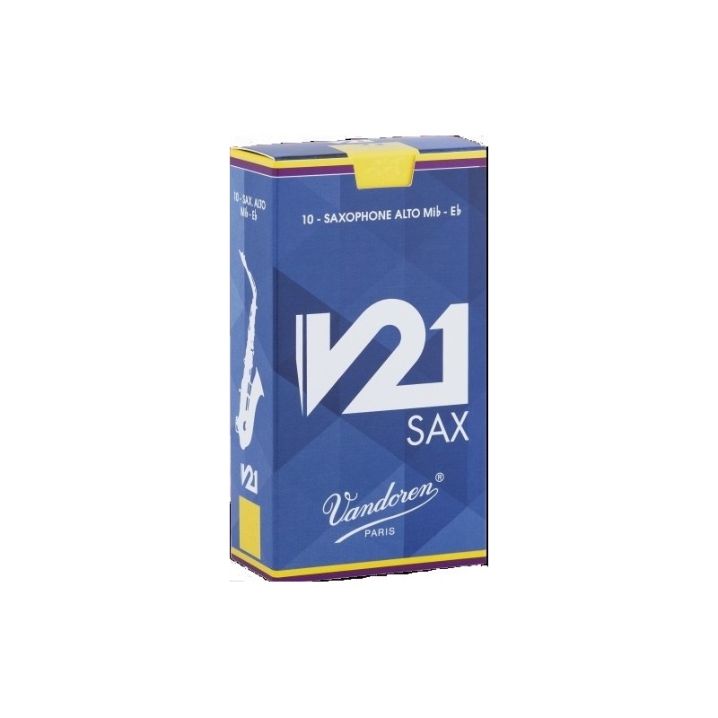 CAJA DE CAÑAS PARA SAXO ALTO.Serie V-21. Caja AzulNúmero 3.Caja de 10 unidades. Ref.SR813Esta caña, cuya corteza no está raspada, es la primera caña para saxofón con forma cónica. Gracias a la V21, obtendréis un sonido de gran pureza, particularmente cálido y centrado, manteniendo una excelente proyección sonora. Esta caña permite un picado preciso, así como una mayor facilidad al cambiar de registro.