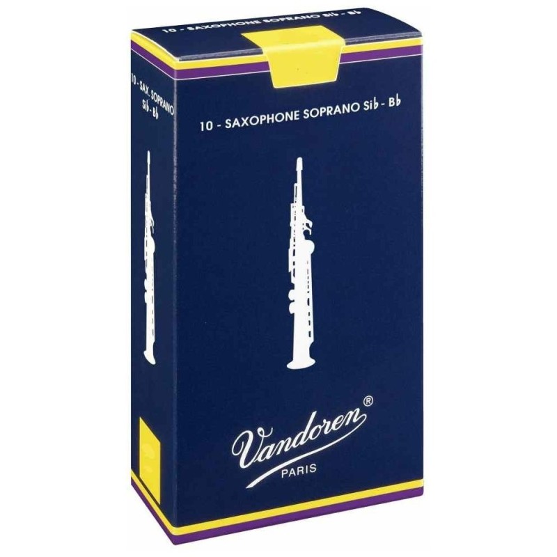 CAJA DE CAÑAS PARA SAXO SOPRANO.Serie tradicional. Caja azulNúmero 3 1/2Caja de 10 unidades. Ref.SR2035Estas cañas se han diseñado para producir un sonido de una extrema pureza, gracias a su punta muy fina (la zona de vibración máxima), equilibrada por una columna vertebral muy sólida (más madera en la zona que conduce gradualmente hacia el talón). Las cañas Tradicionales aúnan la punta más fina con el corazón más grueso, permitiendo así una articulación impecable con una sonoridad llena y oscura.