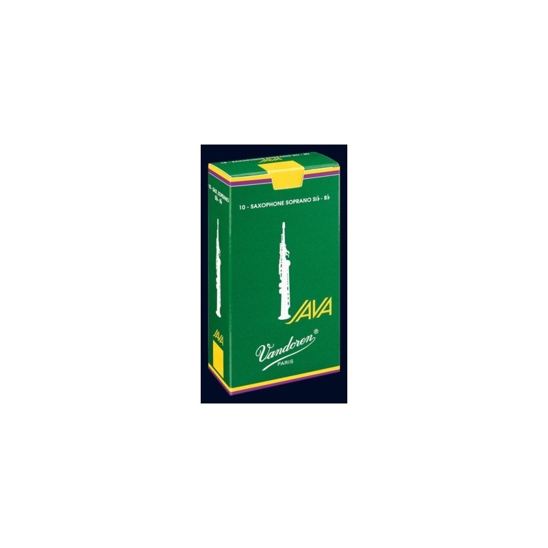 CAJA DE CAÑAS PARA SAXO SOPRANO.Serie JAVA. Caja VerdeNúmero 3Caja de 10 unidades. Ref. SR303Creadas en 1983 para jazz y variedades. Las cañas JAVA tienen un extremo más grueso que las cañas tradicionales y vibran sobre una paleta* más larga,con una elasticidad máxima. Este tipo de columna vertebral, que permite una zona de elasticidad muy grande, ofrece al músico una mayor flexibilidad de interpretación. Las cañas JAVA son más flexibles que las cañas Tradicionales y las V16, vibran sobre una gran paleta, desarrollando, por tanto, un sonido brillante con una respuesta inmediata. * Paleta: zona donde las ondas se propagan con la mayor amplitud. Desde la punta, las ondas son absorbidas más lejos en las cañas JAVA.