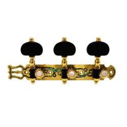 el Luthier Clásica JC102S-E2 es un clavijero para guitarra clásica con acabado oro y incrustaciones abalone, lira, palomilla ovalada negra y ejes forrados de color negro.