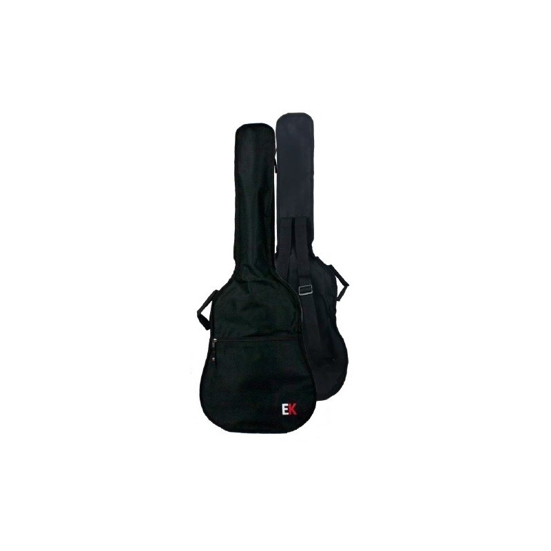 Para guitarra acústica. Funda de Nylon. Correa regulable para mochila. Asa de nylon para llevar en la mano. Bolsillo para partituras. Logo EK.