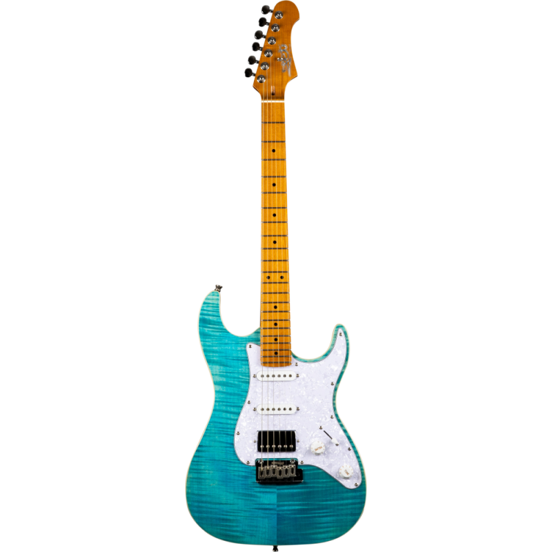 Tipo Modern Stratocaster. Mástil de arce Canadiense y diapasón de palorosa. Cuerpo de Tilo y con la tapa de arce acolchado. Cejuela diapasón de hueso. 2 pastillas simples y 1 doble cerámicas. Selector de 5 posiciones. 1 control de volumen y 1 de tono. 22 trastes. Acabado Ocean blue