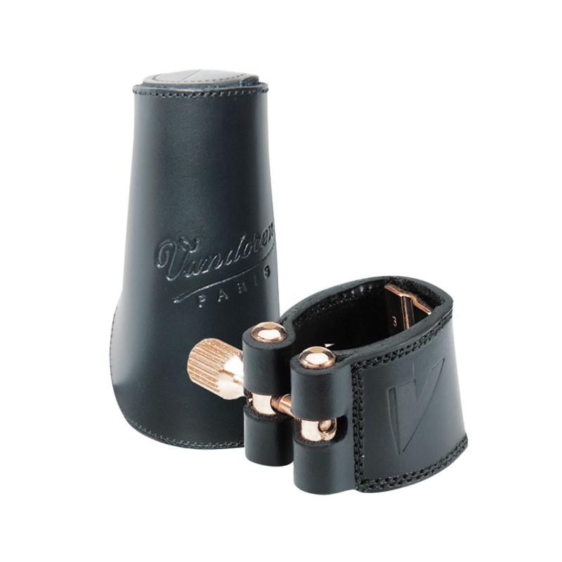 JUEGO DE ABRAZADERA Y BOQUILLERO VANDOREN CUERO LC28LPara saxo tenor con boquillero de cuero.Terminación artesanal.Sonido cálido y redondo.