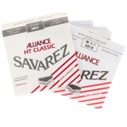 Juego de 6 cuerdas para guitarra clásica Savarez Clásica Alliance HT Classic (540-R) de tensión media. Concretamente, este juego está compuesto por primas KF Alliance Composite (E-Mi, B-Si, G-Sol) y bordones HT Classiques entorchados sobre un multifilamento de nylon Stabilon. Las primas CF son cuerdas fabricadas con materiales composite de los que Savarez tiene la exclusiva mundial. Las fibras composite de KF Alliance tienen la misma densidad y la misma elongación que la "tripa". La densidad es mayor que la de cuerdas de poliamida y son más delgadas que las cuerdas de nylon pudiendo soportar tensiones de hasta 35 Kg. La fricción interna muy baja entre las moléculas aumenta su durabilidad, confiriendo las siguientes características acústicas: Claridad y pureza de sonido, riqueza de timbre, gran sensibilidad, potencia, proyección y una duración prolongada del sonido. Los bordones son entorchados con hilo plateado, con un diseño y tecnología avanzados. En comparación, tienen una mayor rigidez y permite un sonido mas potente. En general, proporcionan una excelente resistencia así como un timbre rico y brillante.