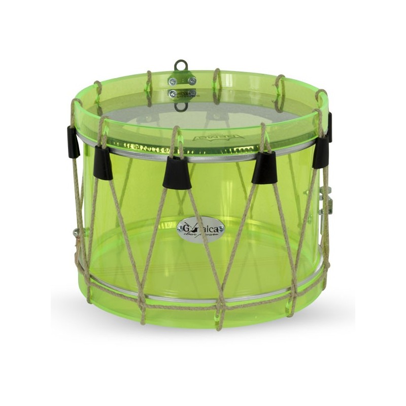 Tabalets valencians fabricados con casco y aros de metacrilato de diferentes colores. Cuerda de cáñamo y tensores de piel. Parche Remo Emperor Colortone a excepción del transparente y verde claro. Parche Remo UT bordonero. Bordon seda. Peso: 2,33Kg.